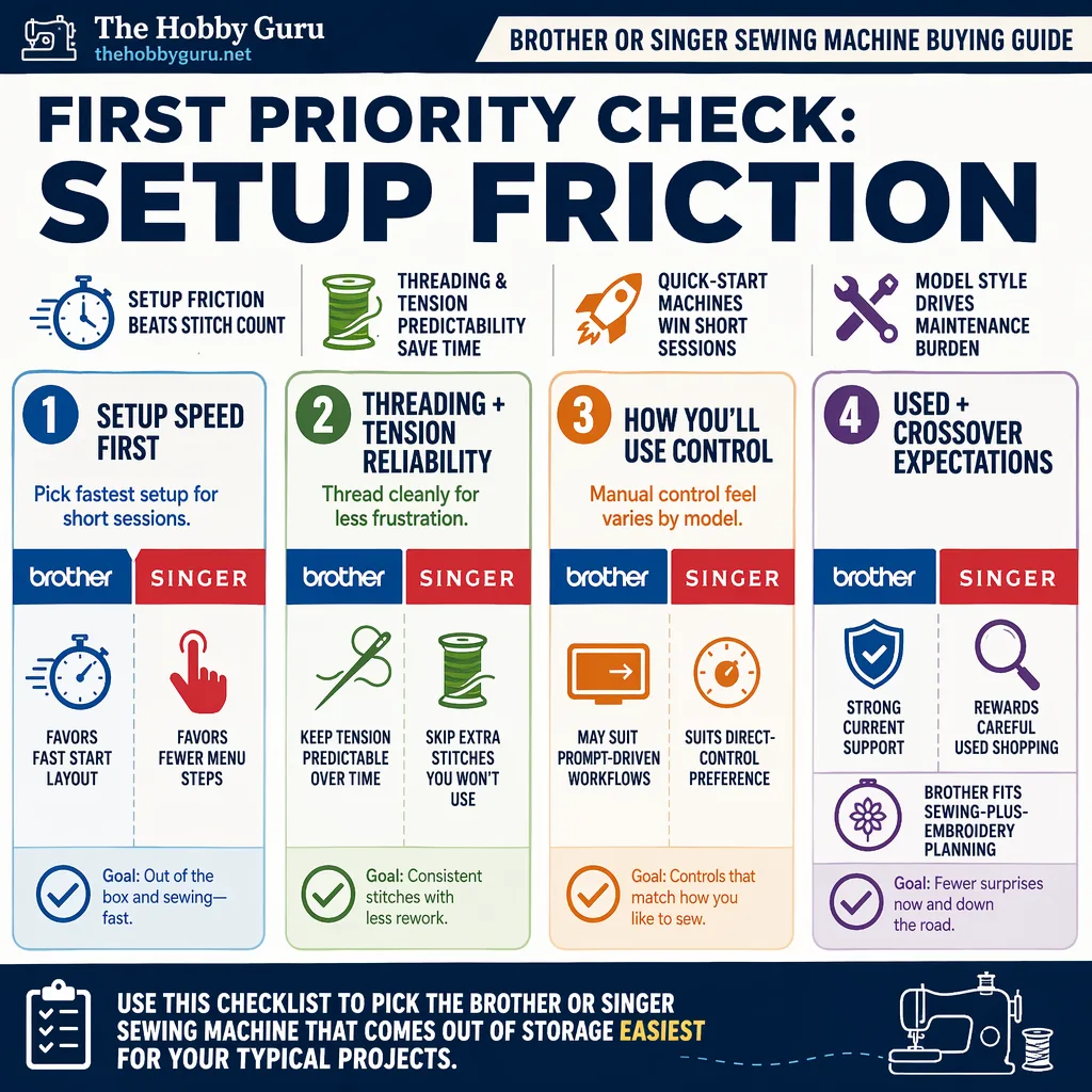 Prioritize setup friction before stitch count. A Brother or Singer sewing machine decision turns on how often the machine comes out of storage and how much time you spend getting from case to seam.