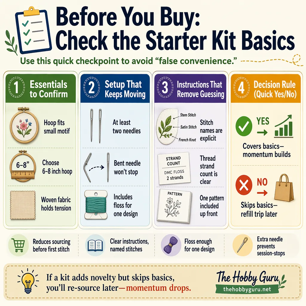 Start with the simplest comparison anchor, a basic hoop plus floss, needles, fabric, and one pattern. A kit earns its place when it reduces the number of things you need to source before the first stitch. If it adds novelty items but leaves you guessing about thread count or stitch order, it shifts work onto the beginner instead of removing it.