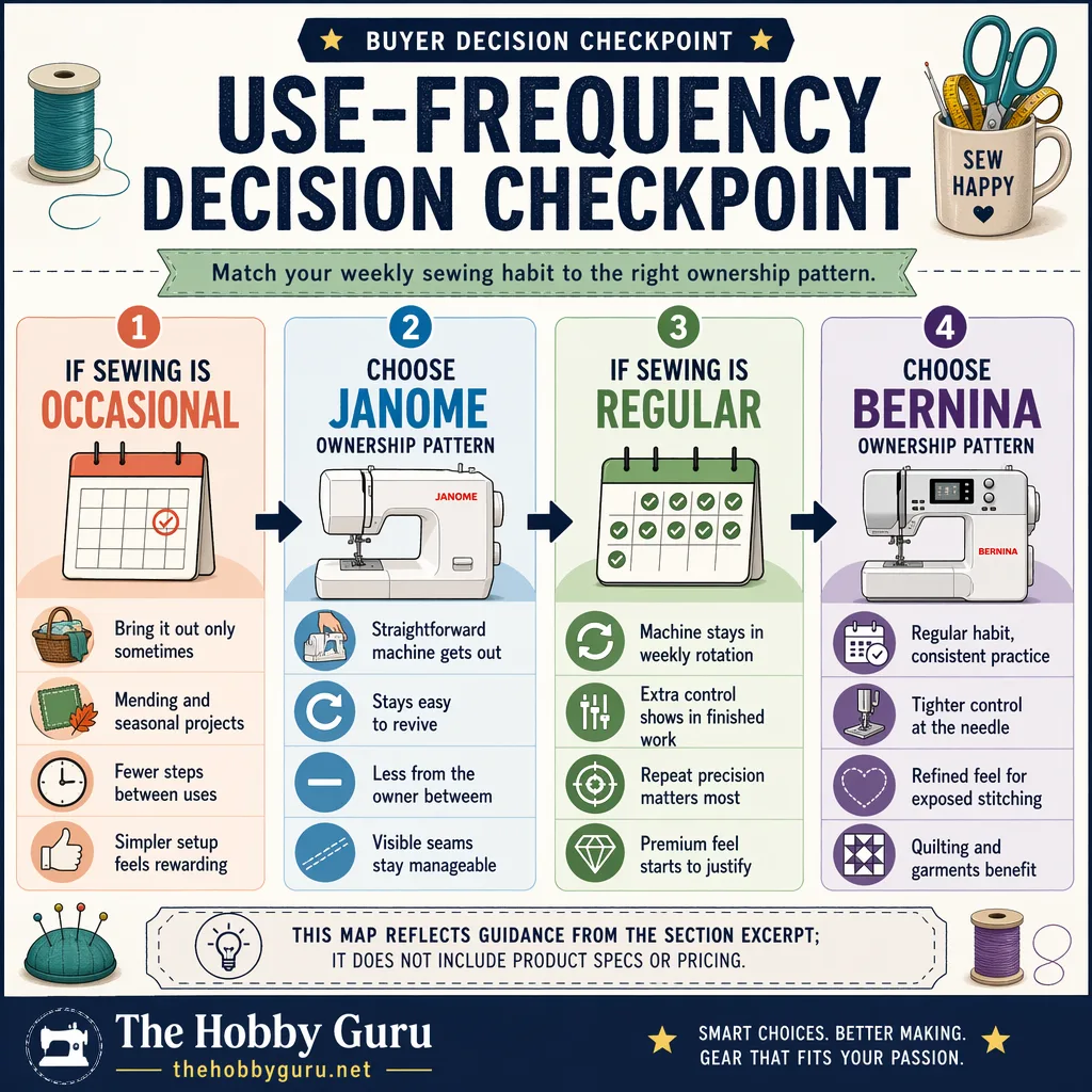 Start with how often the machine will sit ready on the table, not how impressive the brand name sounds. Janome wins when you want a straightforward machine that gets out of the way and stays easy to bring back to life after a few days off. Bernina wins when sewing is a regular habit and the extra control shows up in the work you actually finish.