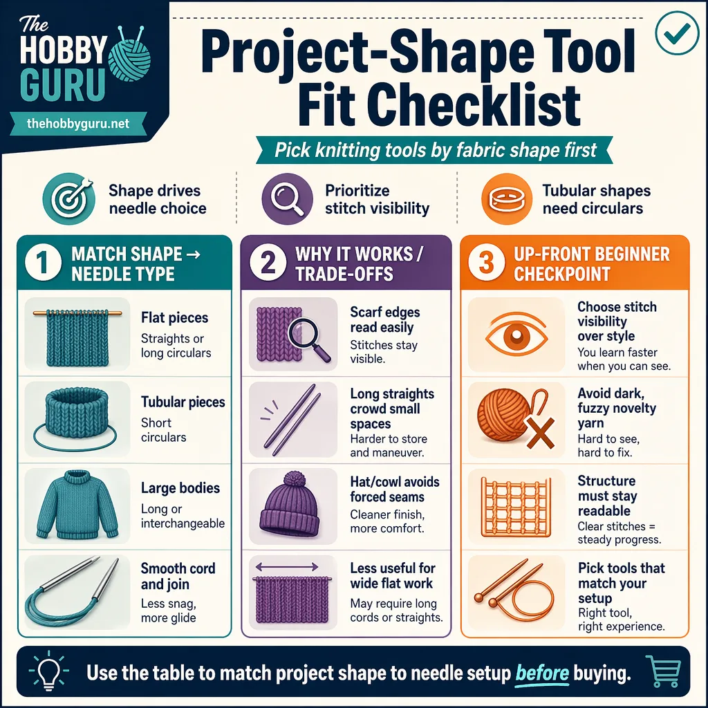 Start with the shape of the fabric, not the size of the bundle. A scarf, a hat, and a sweater body demand different needle lengths, different cord behavior, and different amounts of setup room.