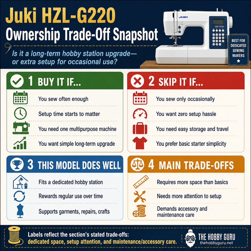 The juki hzl-g220 sewing machine is a sensible buy for a fixed sewing corner and regular hobby projects, not for a buyer who needs the lightest or simplest machine on the shelf. The answer changes if the machine has to move after every session, if the buyer wants the shortest learning curve, or if the sewing list stays limited to occasional hems and quick repairs. This model earns its place when repeat sewing matters more than a tiny footprint.